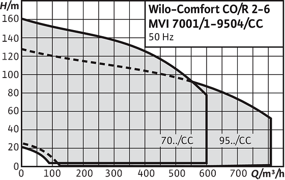 - Pompalar: MVI 2 ilâ MVI 95 ürün serisinin paralel bağlı 2 ilâ 6 pompası kullanılır; bu pompaların akışkanla temas eden tüm parçaları paslanmaz çelik veya MVI 16..’dan itibaren pik döküm (kataforez) kaplıdır ya da istek üzerine paslanmaz çelik olarak sunulur.
